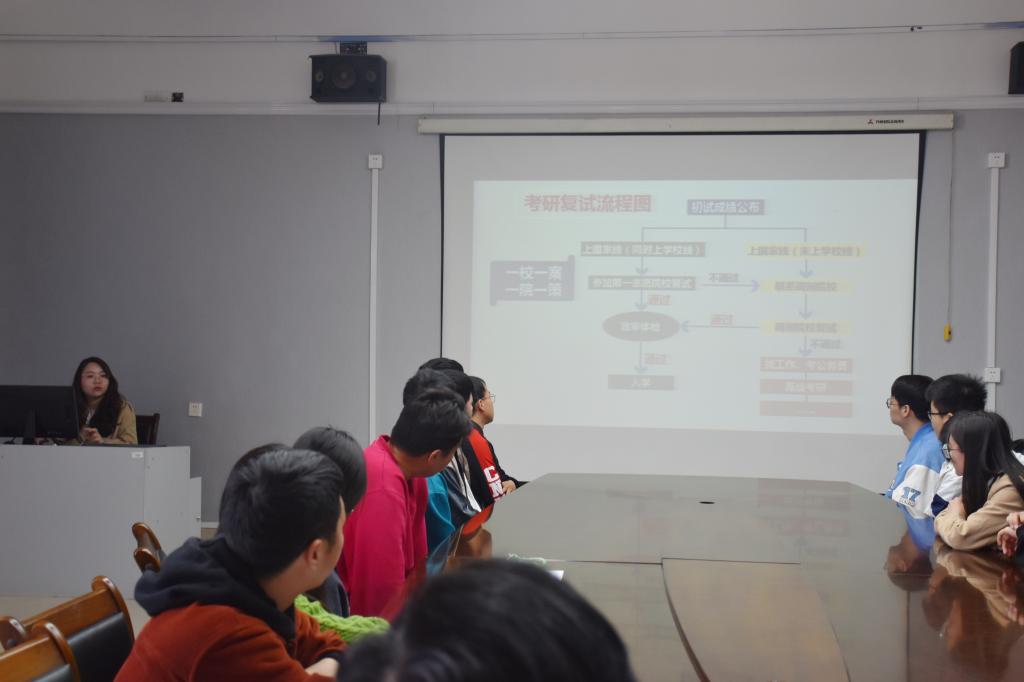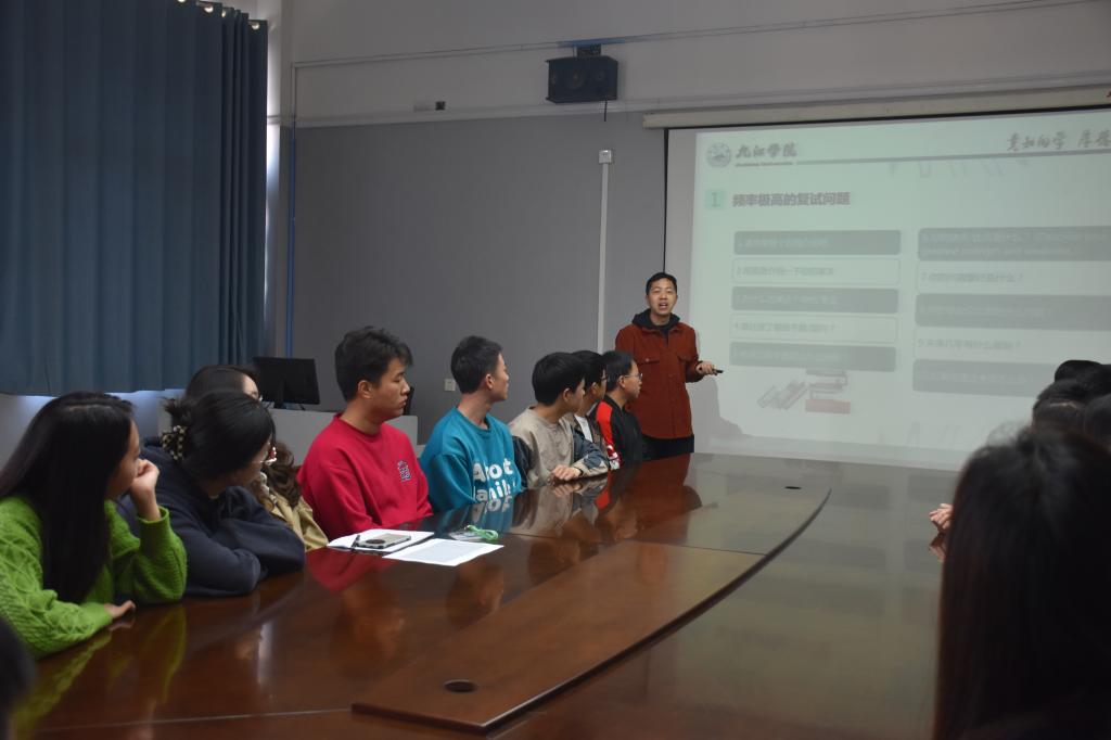 毕业班班主任就考研情况做了详细介绍,并表达了对考研学子们的信心和期待。江晓宇和田莉萍两位博士分别结合自身考研经历从考研复试技巧、复试问题、自我介绍、政策解读、前期准备、复试流程和调剂流程等方面进行了介绍和指导。