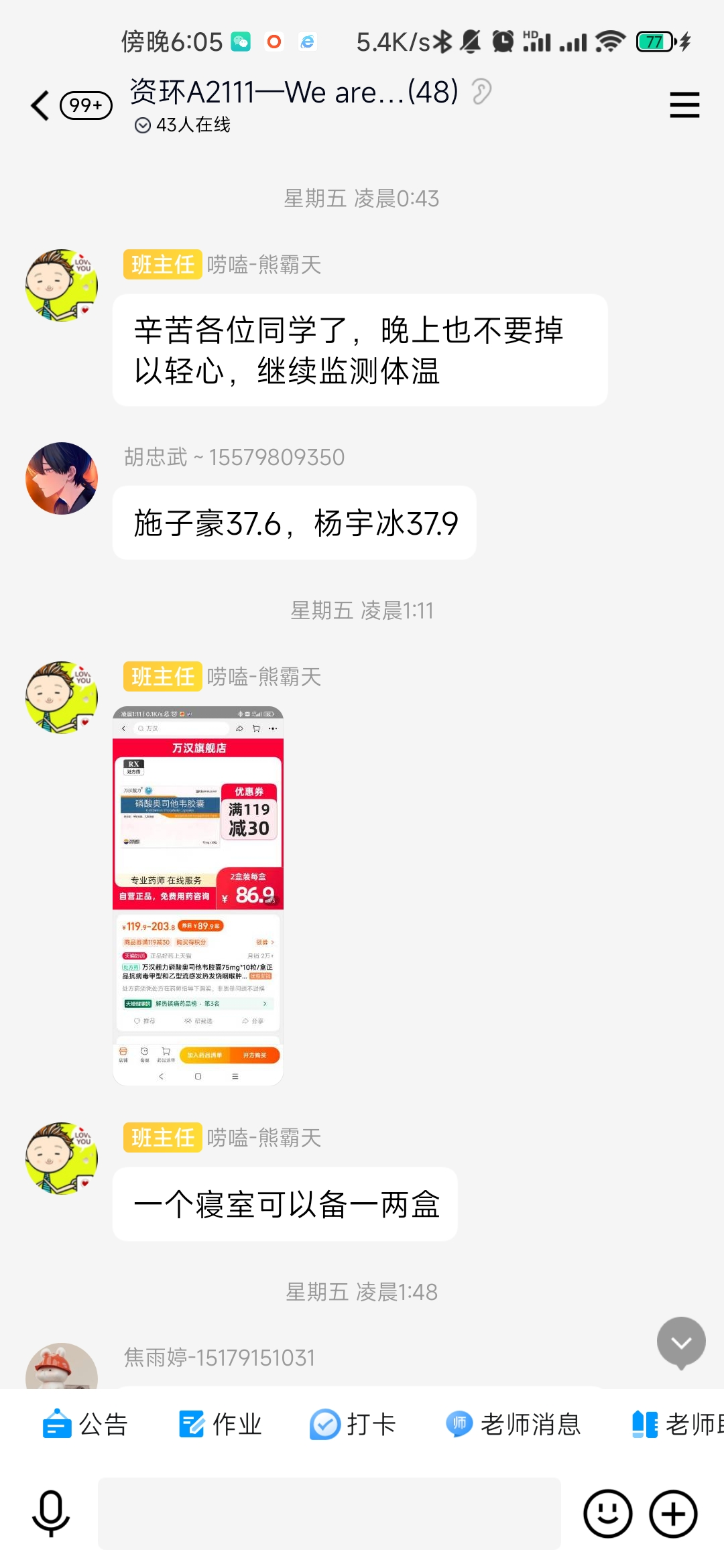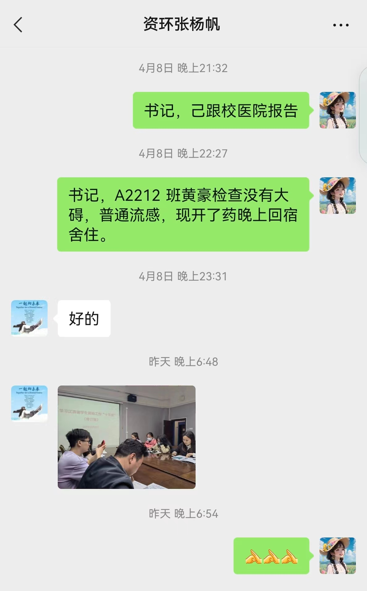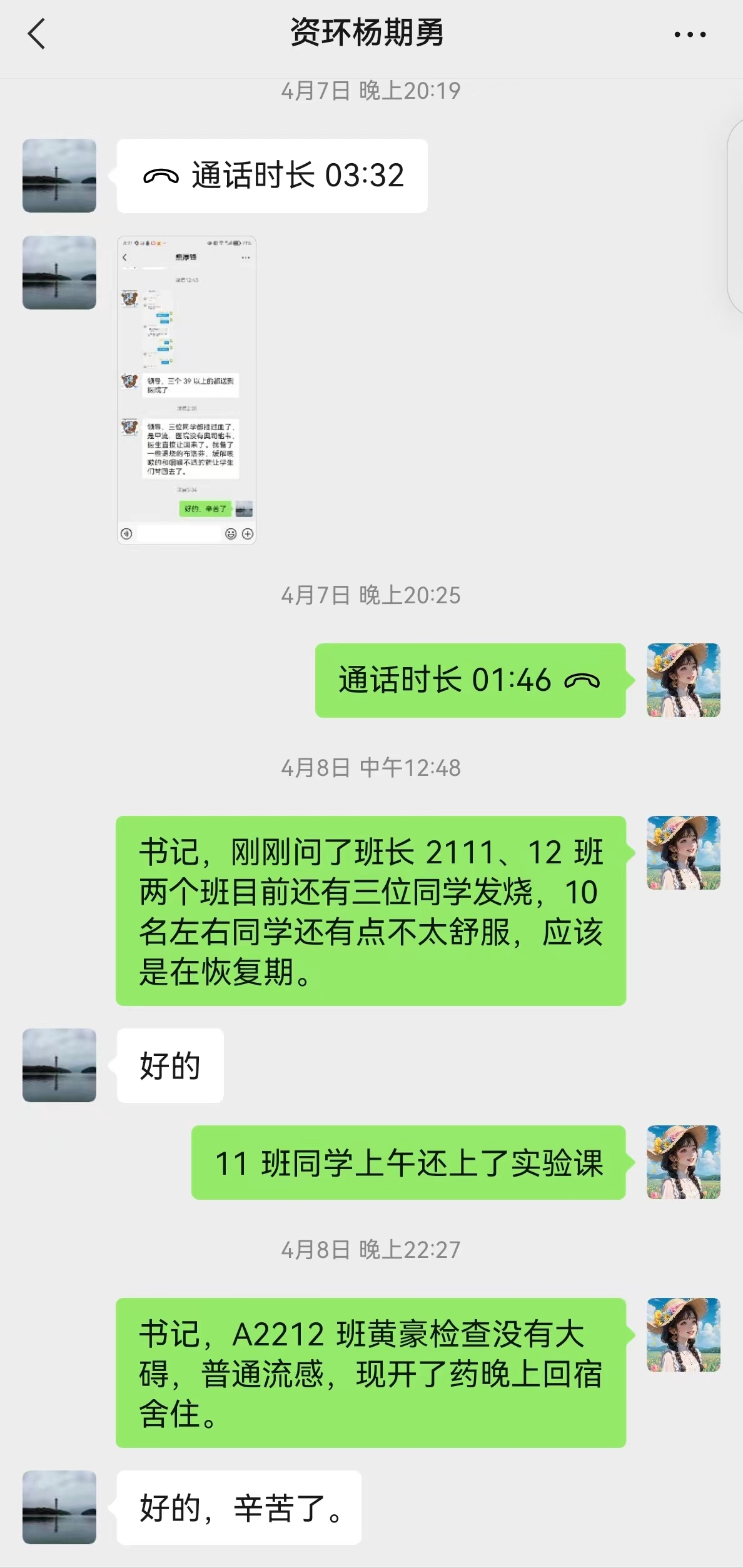 4月6日傍晚,MK体育A2111、A2112、A2212班班主任熊厚锋、黄亮、李浩然三位班主任接到班干的电话报告发现班级多名同学有感冒发烧不舒服的症状,立即赶到宿舍看望员工,带员工就医,直至凌晨。