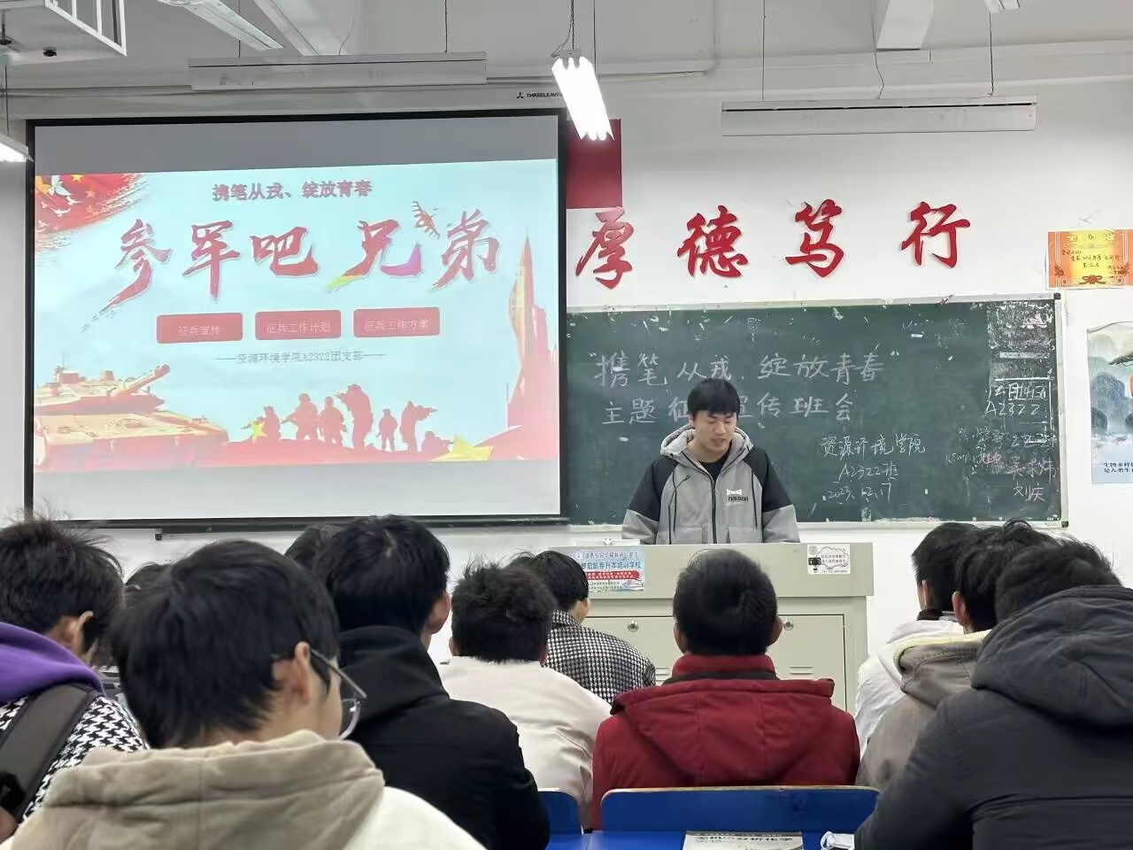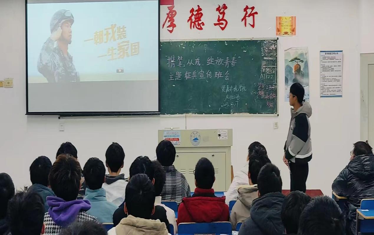 为落实MK体育官网《关于组织开展2024届的毕业生“携笔从戎、绽放青春”主题征兵宣传活动的通知》(九院学字[2023]48号)文件精神,进一步激发员工的参军报国热情,MK体育于12月18日晚上组织各班级开展了“携笔从戎,绽放青春”主题征兵宣传班会。