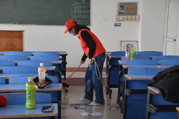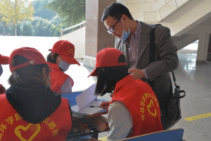 活动开始,志愿者们首先将竞知楼一至四楼的面试会场进行打扫清理,为企业面试提供一个干净整洁的环境;对于进入面试场地的企业进行体温测量和场地分配工作,确保活动安全的有序进行。