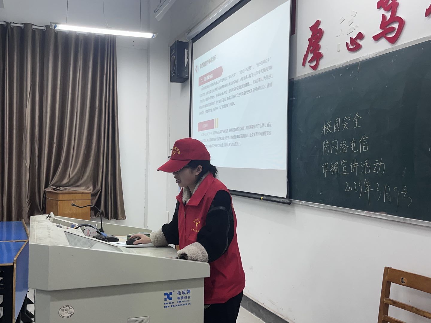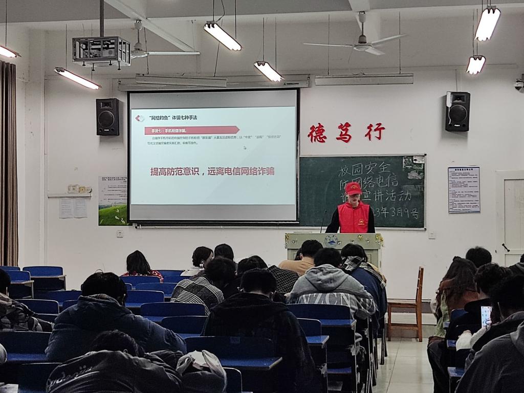 宣讲过程中,志愿者结合丰富多图的PPt和视频的方式在各班级进行防网络电信诈骗知识的宣传和普及,详细揭露了电信网络诈骗的步骤和伎俩,并着重开学以来“冒充QQ好友诈骗”,“网络兼职”等不少员工发生过的诈骗案例进行分析讲解。