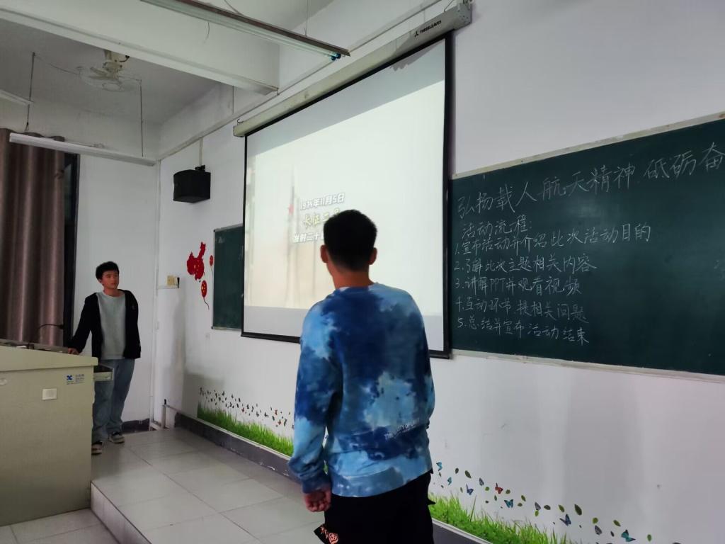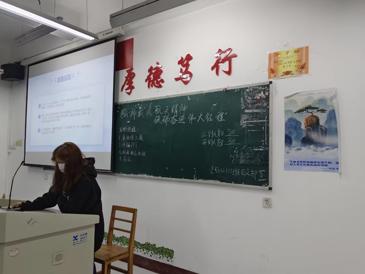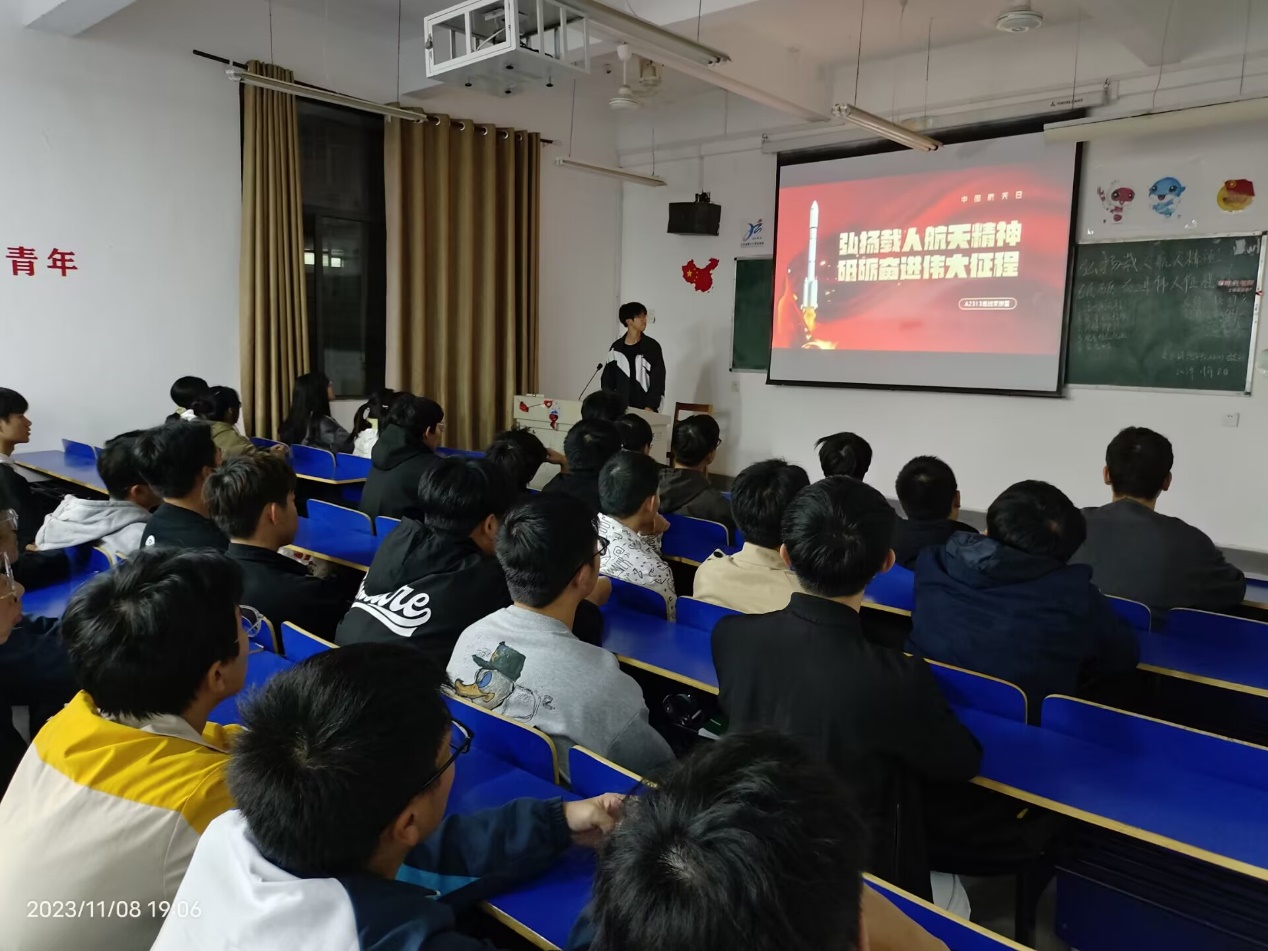 此次活动中,各团支部通过PPT的讲解讲述了中国航天日的由来和意义,以及中国航天事业的发展历程。同时以视频的形式展示了我国航天技术的发展,变迁和突破以及取得的重要成果。各团支部组织团员和青年们观看了神州十七号顺利升空的直播视频,介绍了本次航空工作的相关航天人员以及此次发射的意义,并于现场随机提问航天航空小知识。团日活动的最后,同学们对此次主题团日的活动内容进行交流和总结。