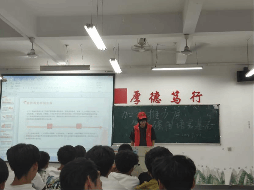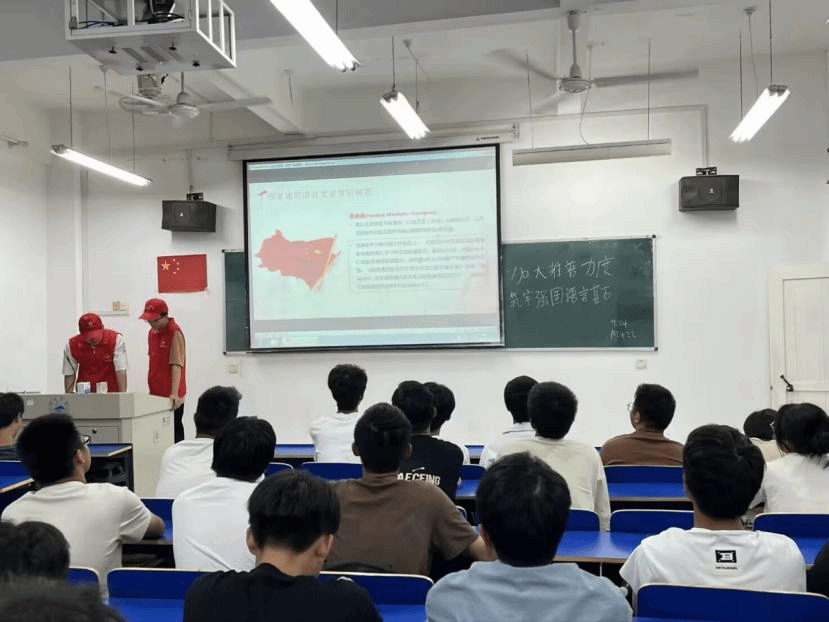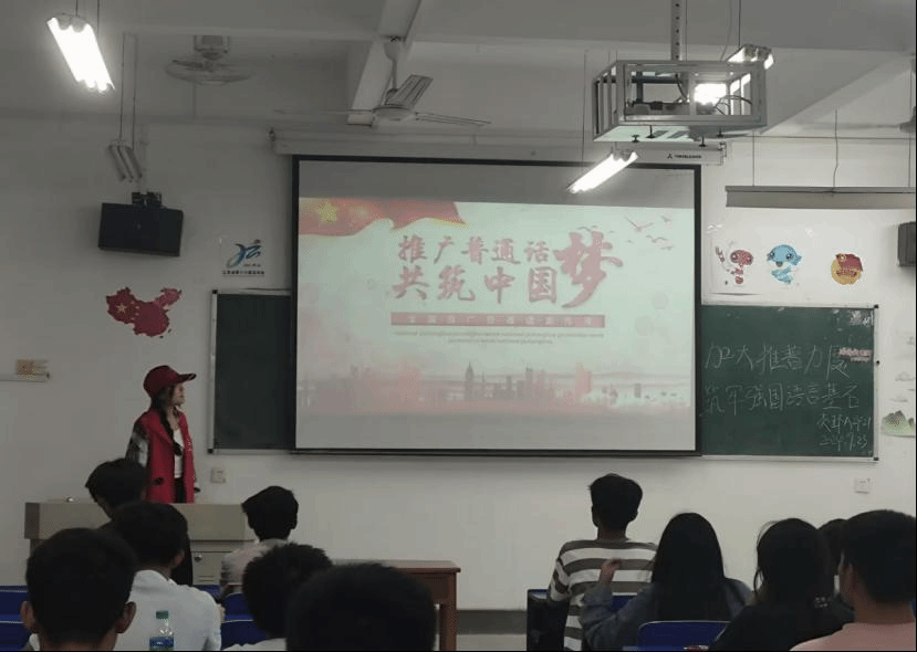 本次宣讲活动得到了广老员工的积极反应,志愿者们组成小队,走进各班教室进行宣讲。志愿者通过图文并茂的PPT、举例分析等形式综合地介绍了推广普通话的必要性,使同学们了解到推广普通话有利于维护国家主权和民族尊严,有利于国家统一和民族团结,有利于社会主义物质文明建设和精神文明建设。