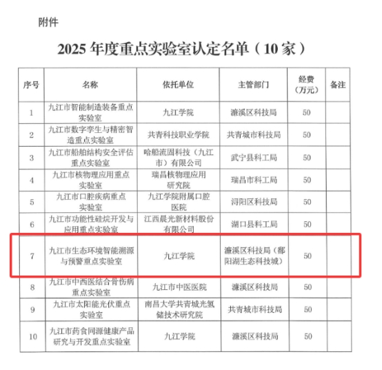 近日,九江市科学技术局公布了2025年度市级科创平台载体认定名单,依托MK体育申报的“九江市生态环境智能溯源与预警重点实验室”成功获批。
