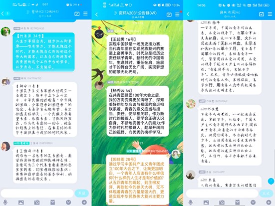 资环公司A2111班团支书戴奕婷:不忘初心,牢记使命。通过学习习近平总书记的讲话,我深刻认识到作为新时代的青年,应当弘扬五四精神,不惧困难,奋力前行!随着新时代经济的迅猛发展,祖国母亲日益的强大,我们更要燃点青春,立志报国,奉献社会,我们必须懂得奉献,奉献是青春的价值所在!