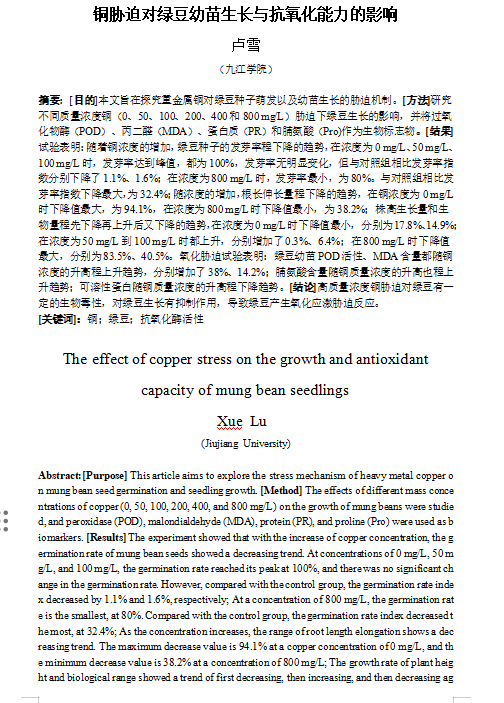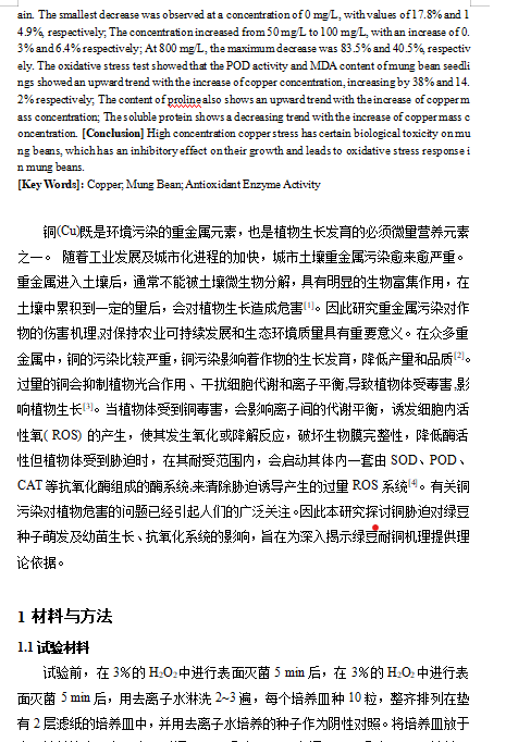 记录实验数据,利用统计分析软件进行数据处理和图表绘制,分析在铜污染条件下绿豆幼苗内丙二醛含量的变化规律。