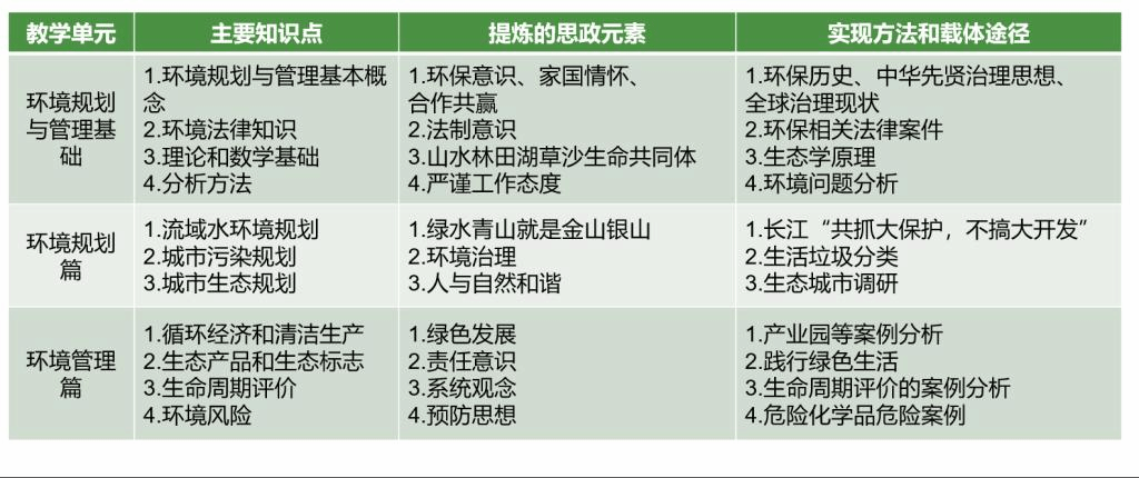 在对课程整体设计的基础之上,确定生态文明(绿色发展、人与自然和谐)、职业素养(工程伦理、系统思维)和爱国主义(科技报国、责任担当)的特色鲜明思政主题,并提炼生态文明地域特色资源,构建具有地域特色的生态文明教育资源库。同时创新融合方式,采用线上线上混合式教学方式,践行“公司-社会-企业”多元协同的生态文明实践育人模式,进行多元考核评价方式,形成可执行的课程思政教学方案,并持续优化完善。